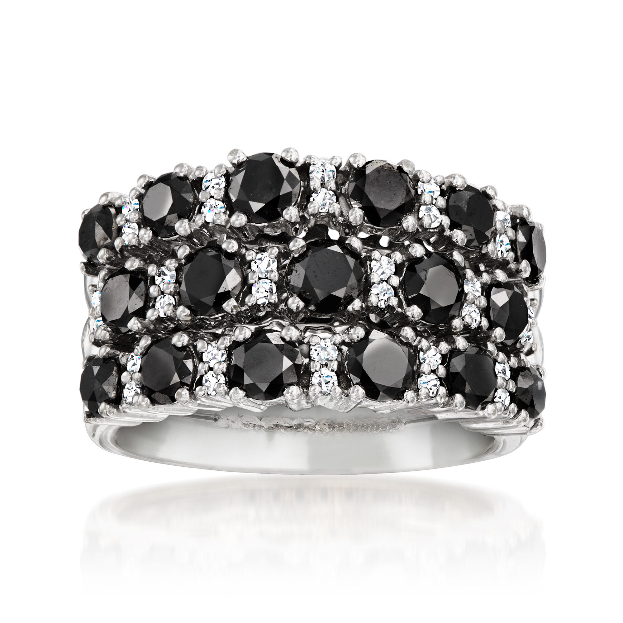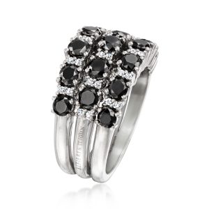 C. 1990 Vintage 2.47 ct. t.w. Black and White Diamond Three-Row Ring in 18kt White Gold. Size 7