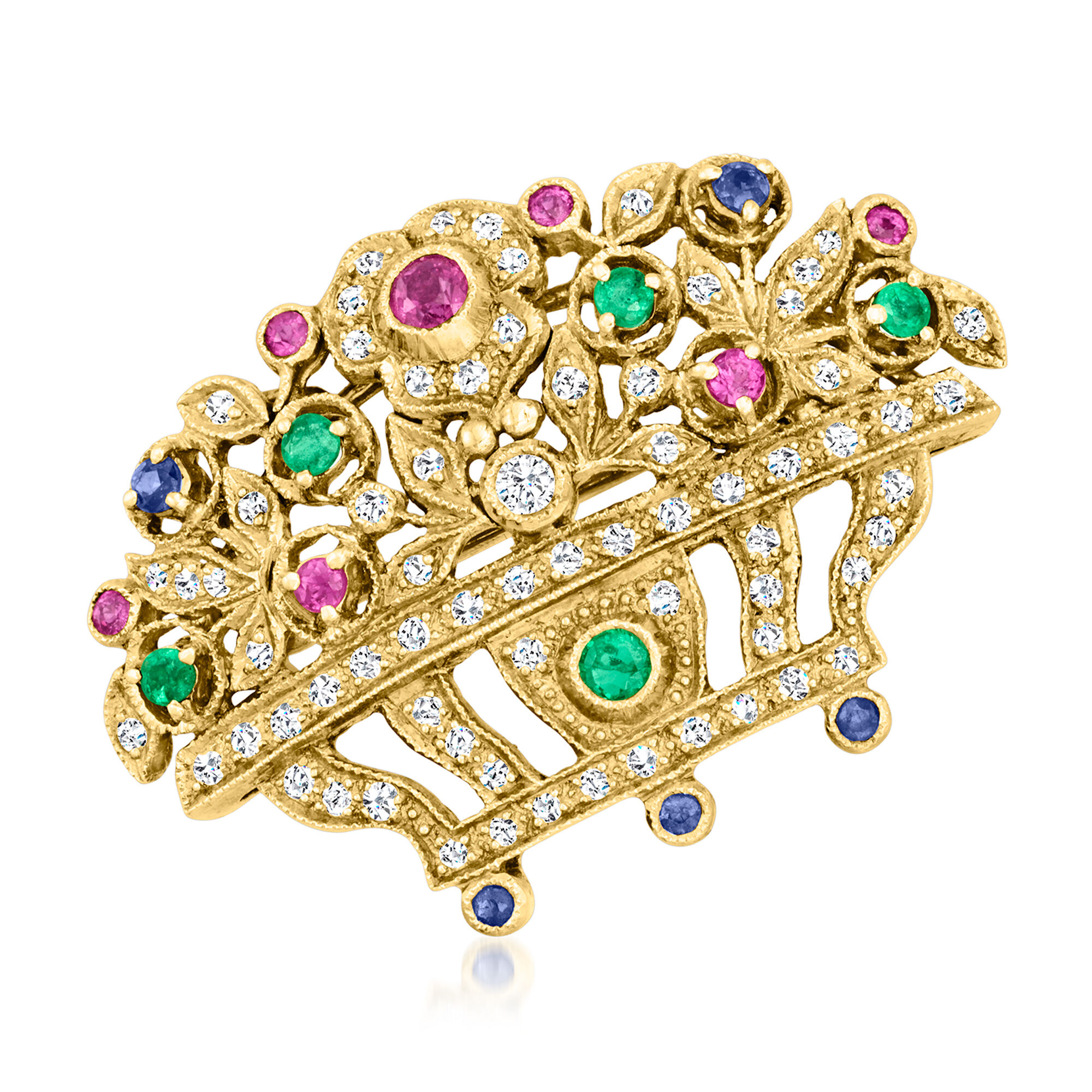 C. 1990 Vintage .60 ct. t.w. Multi-Gemstone Flower Basket Pin with .50 ct. t.w. Diamonds in 18kt Yellow Gold
