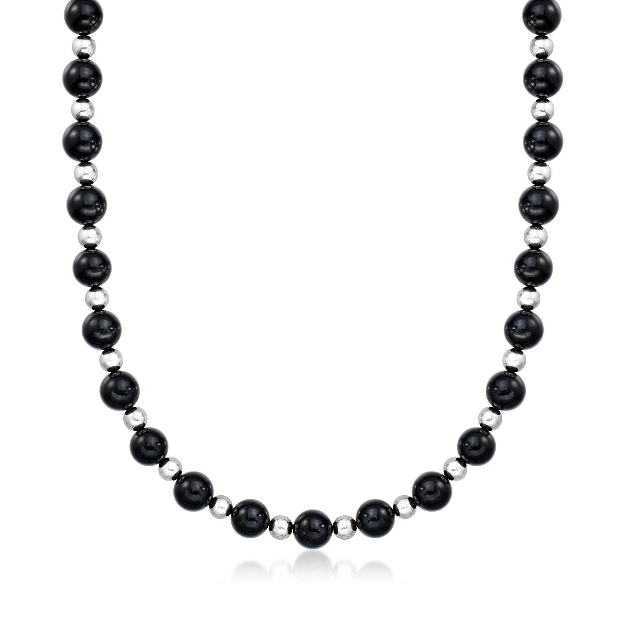 C. 1990 Vintage 9.9-10mm Onyx Bead Necklace with Sterling Silver. 29″