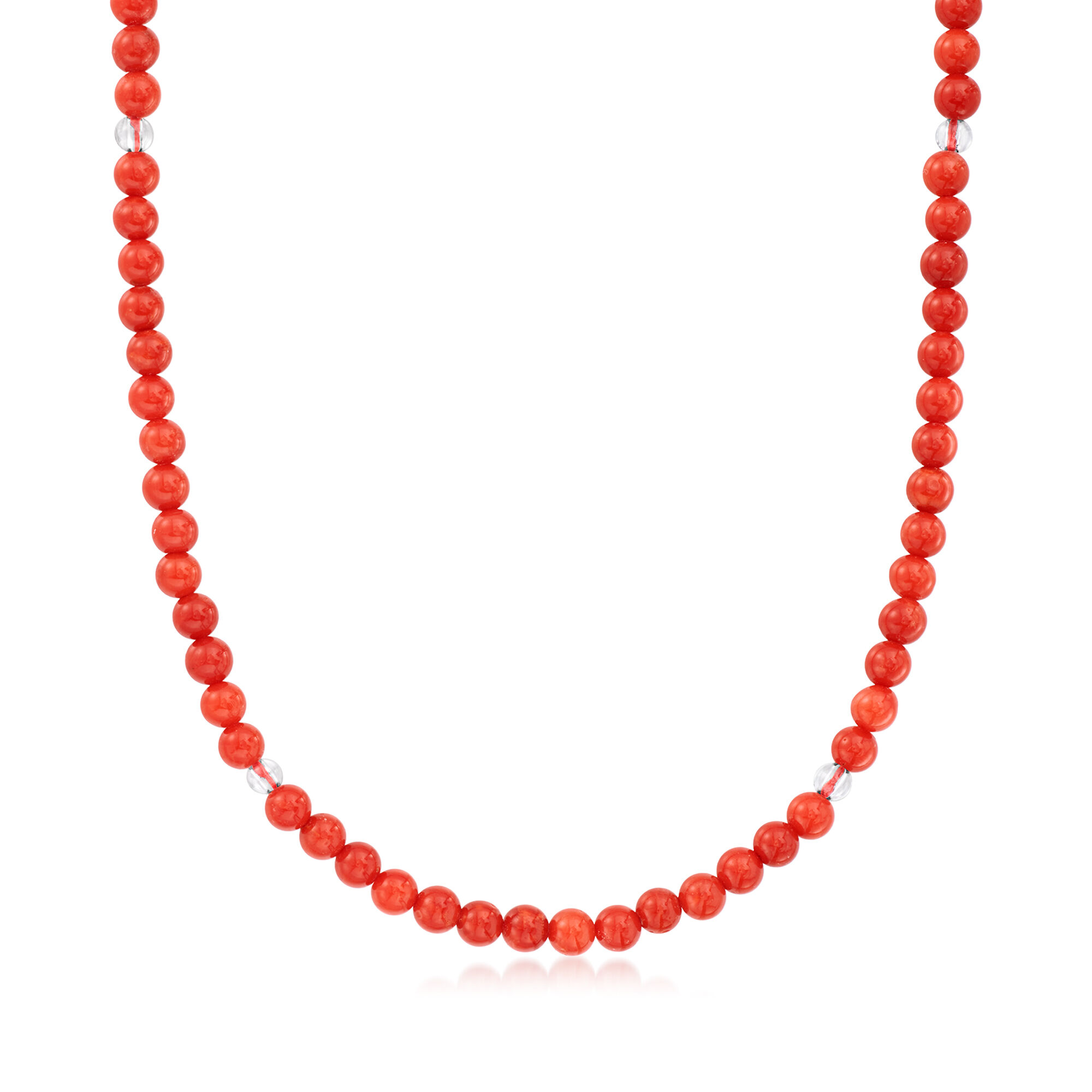 C. 1990 Vintage Red Coral and Rock Crystal Bead Necklace with 14kt Yellow Gold. 23″