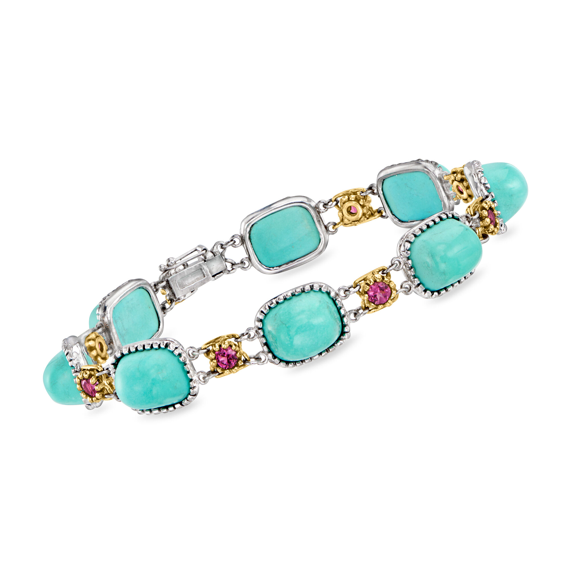 C. 1990 Vintage Turquoise and 1.20 ct. t.w. Rhodolite Garnet Bracelet in 18kt Two-Tone Gold. 7.5″
