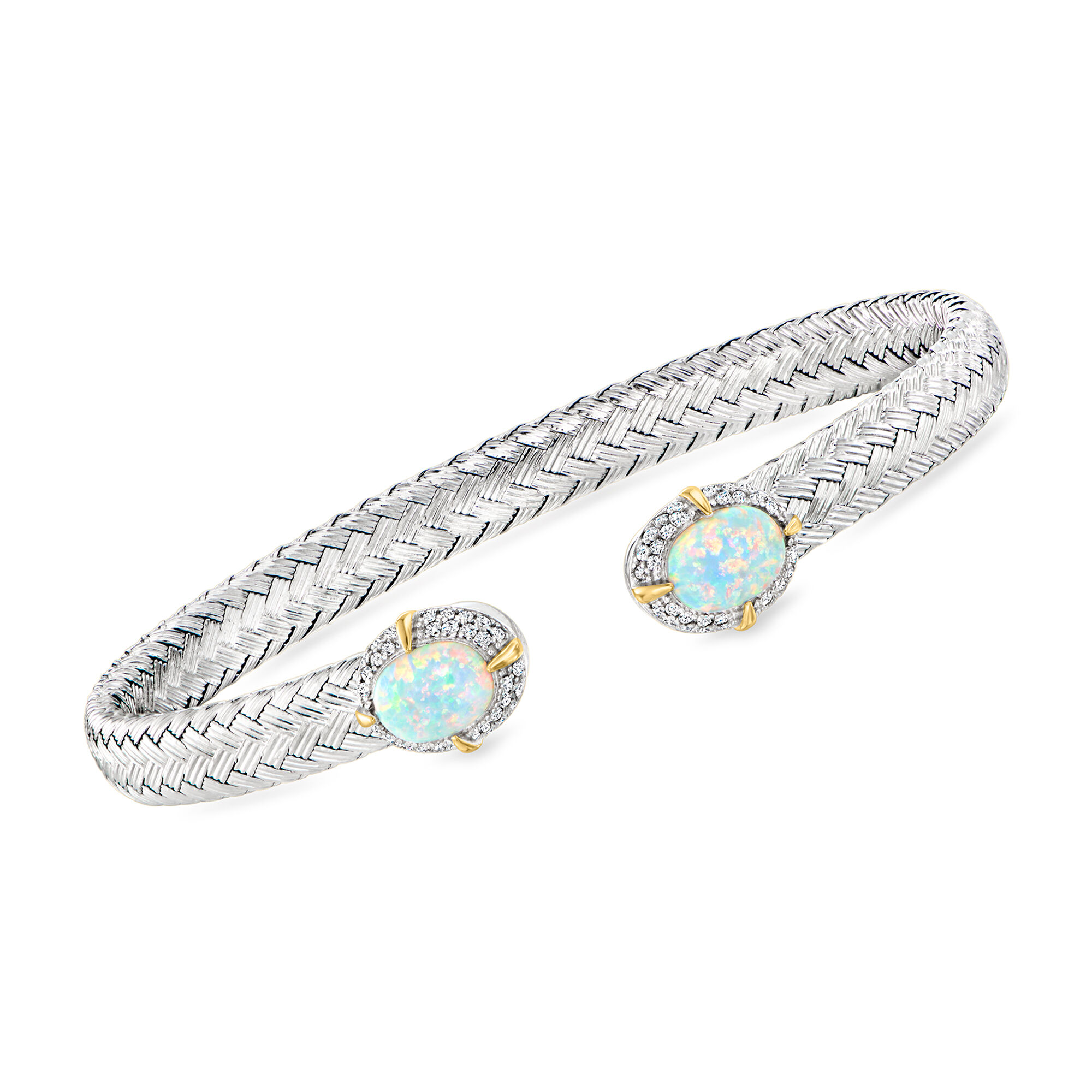 Charles Garnier “L’Opal” Lab-Grown Opal and .30 ct. t.w. CZ Cuff Bracelet in Sterling Silver with 18kt Gold Over Sterling. 7.5″