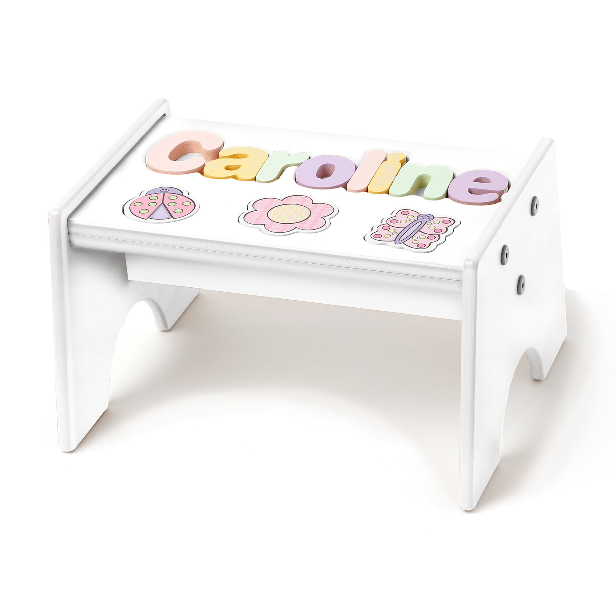 Child’s Personalized Name Garden-Themed White Puzzle Stool – Pastel Colors