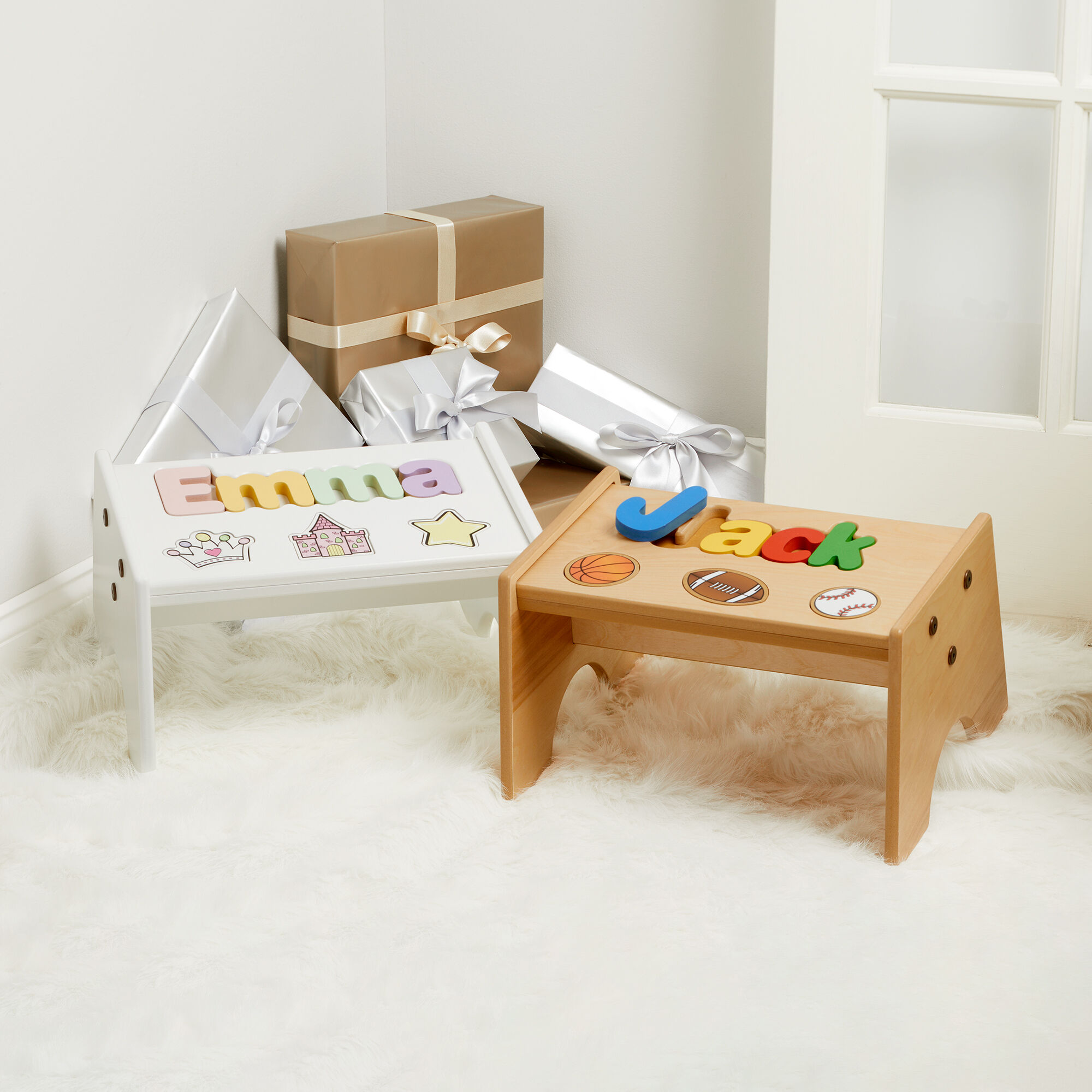 Child’s Personalized Name Garden-Themed White Puzzle Stool – Pastel Colors