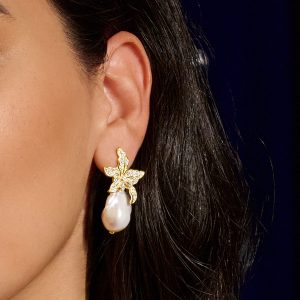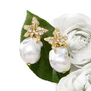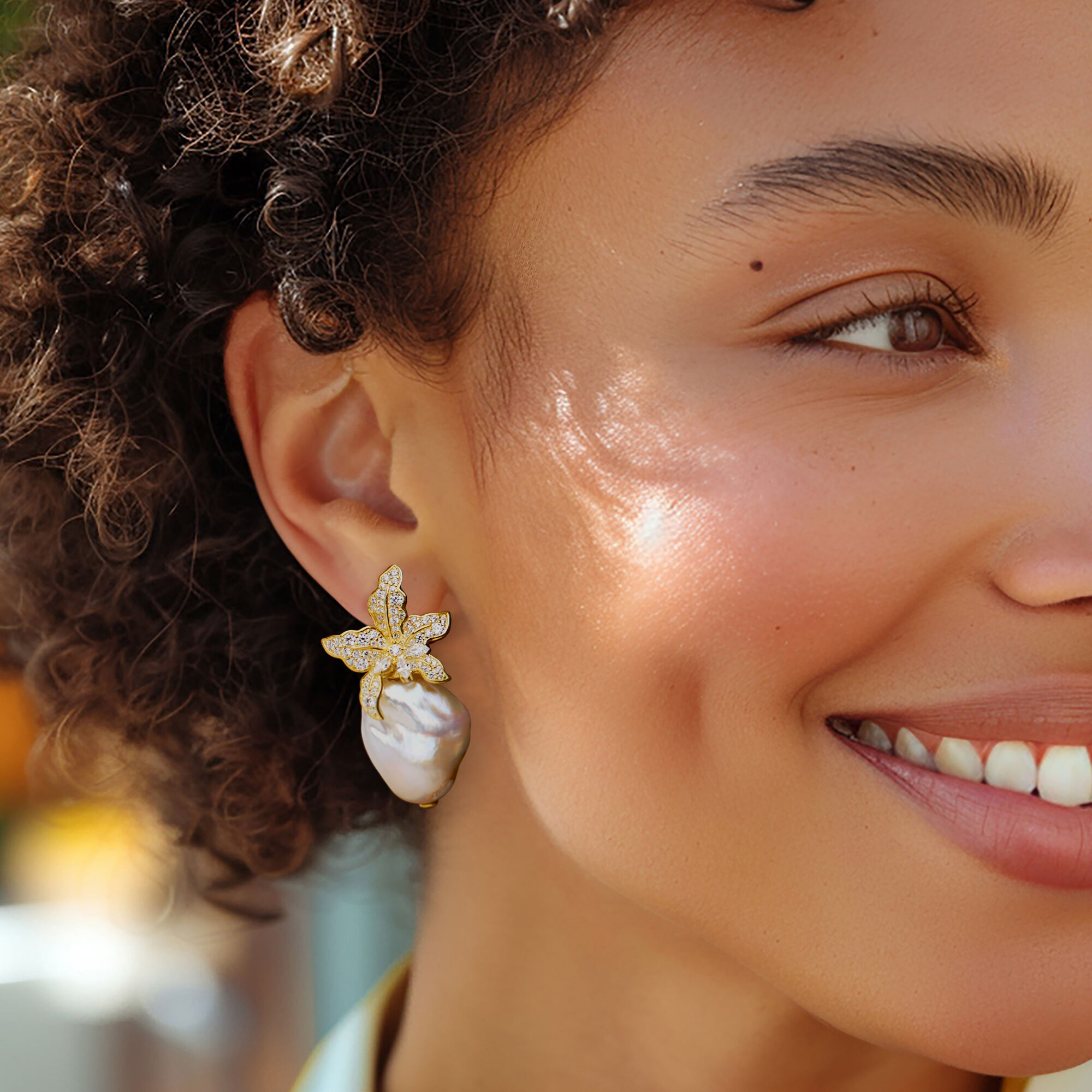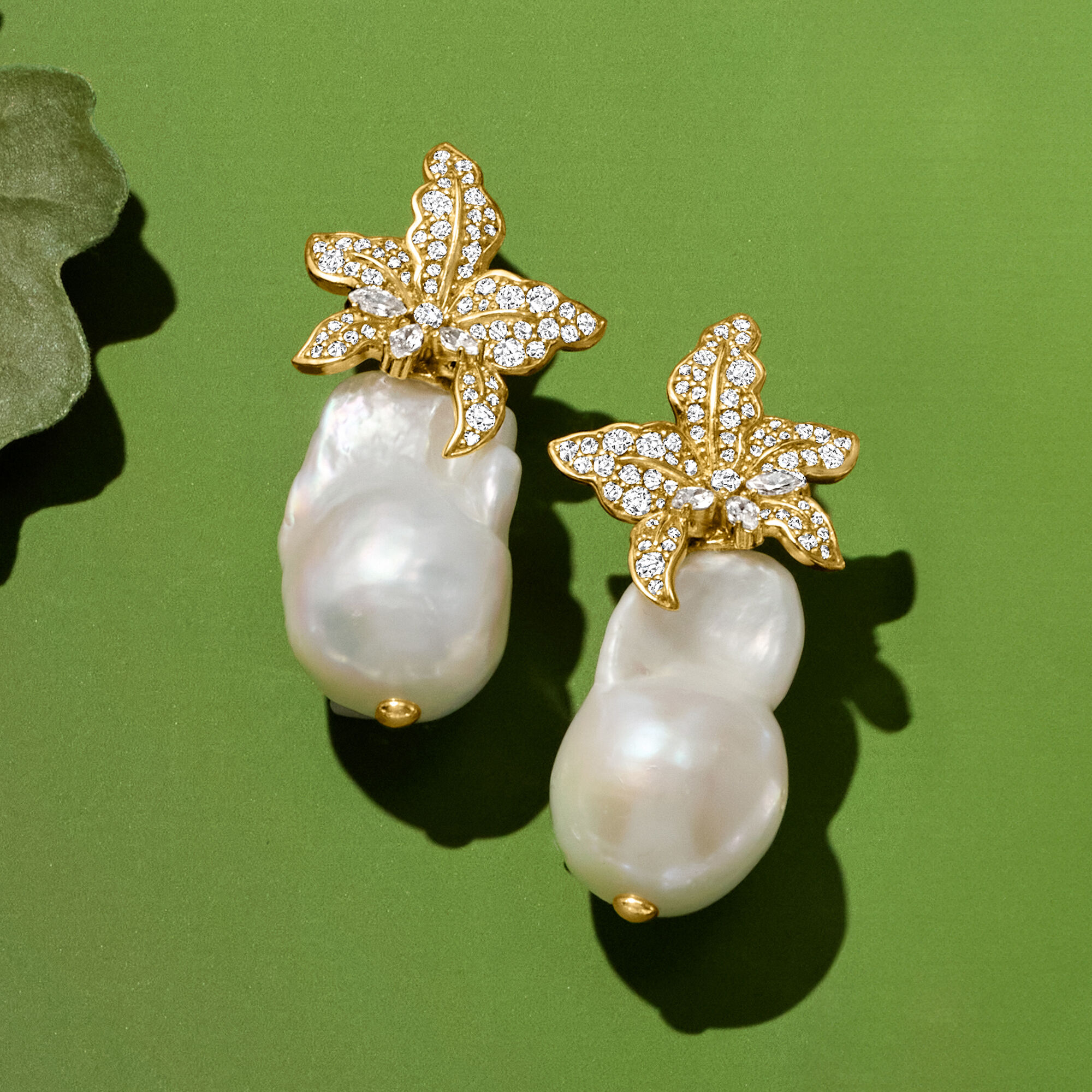 Italian 13-18mm Cultured Baroque Pearl and 1.80 ct. t.w. CZ Flower Earrings in 18kt Gold Over Sterling
