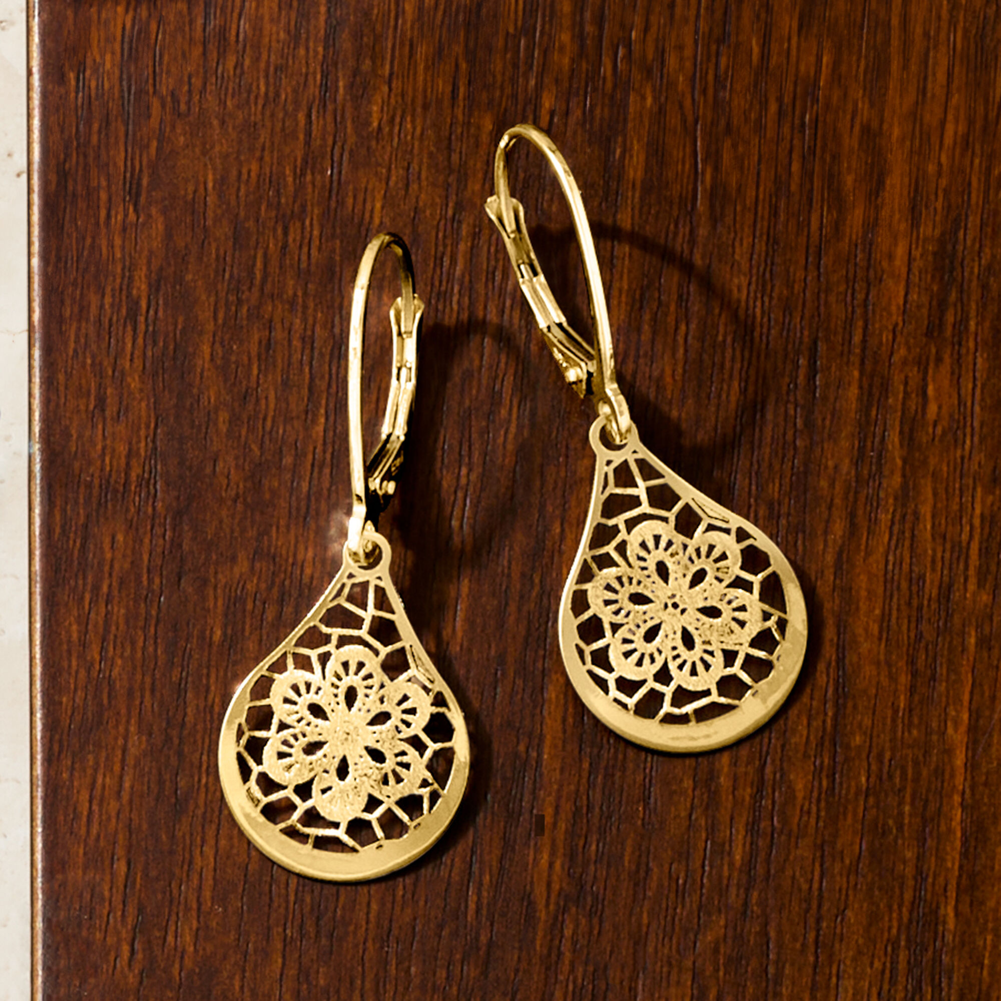 Italian 14kt Yellow Gold Openwork Floral Lace Teardrop Earrings