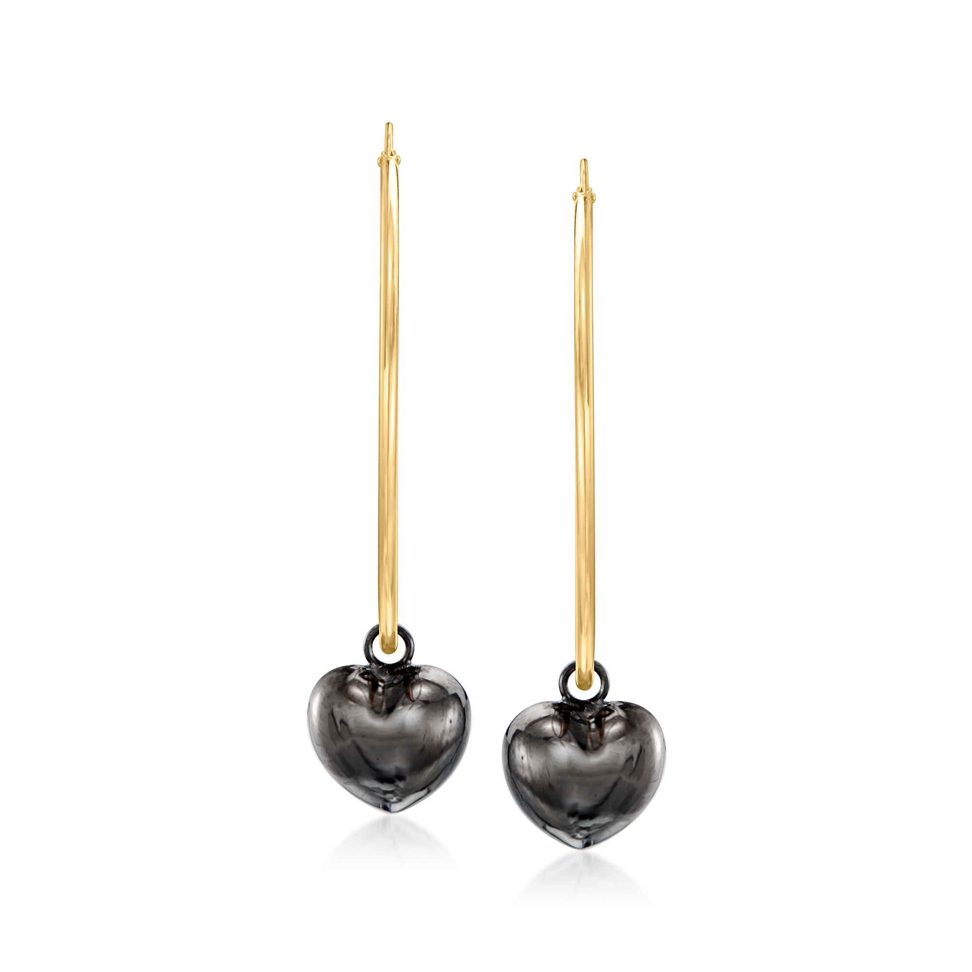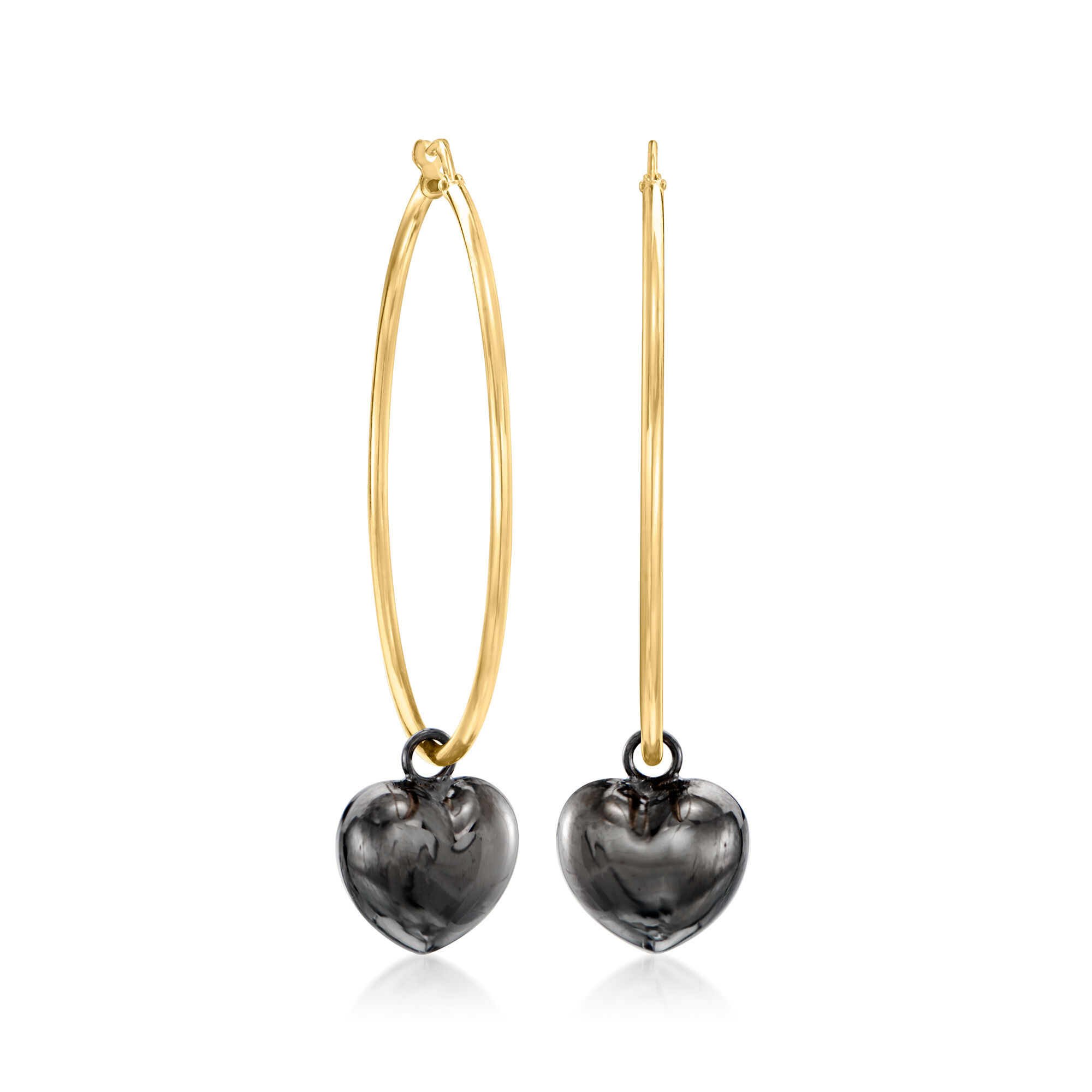 Italian 18kt Gold Over Sterling Hoop Earrings with Removable Black Rhodium and Sterling Silver Heart Charms. 2 1/4″