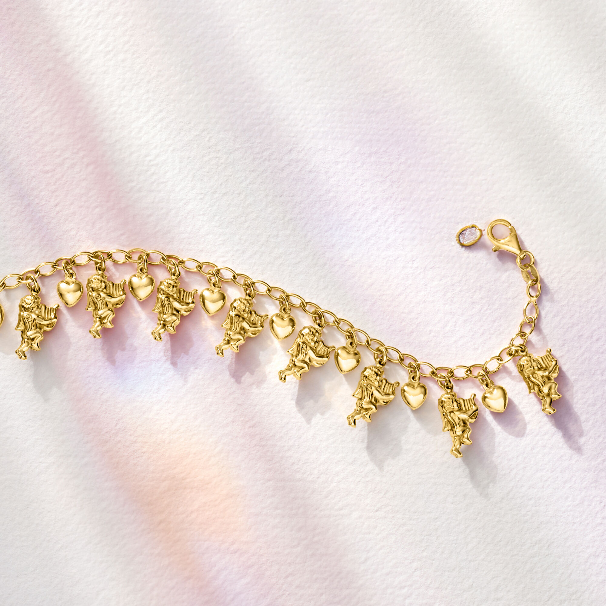 Italian 18kt Gold Over Sterling Silver Cherub and Heart Charm Bracelet. 7″