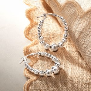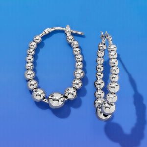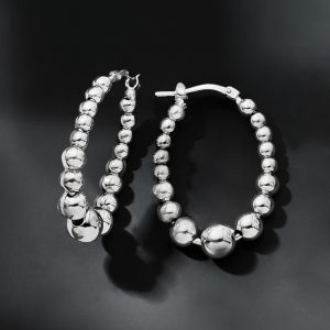 Italian 3-6mm Sterling Silver Bead Oval Hoop Earrings. 1 1/8″