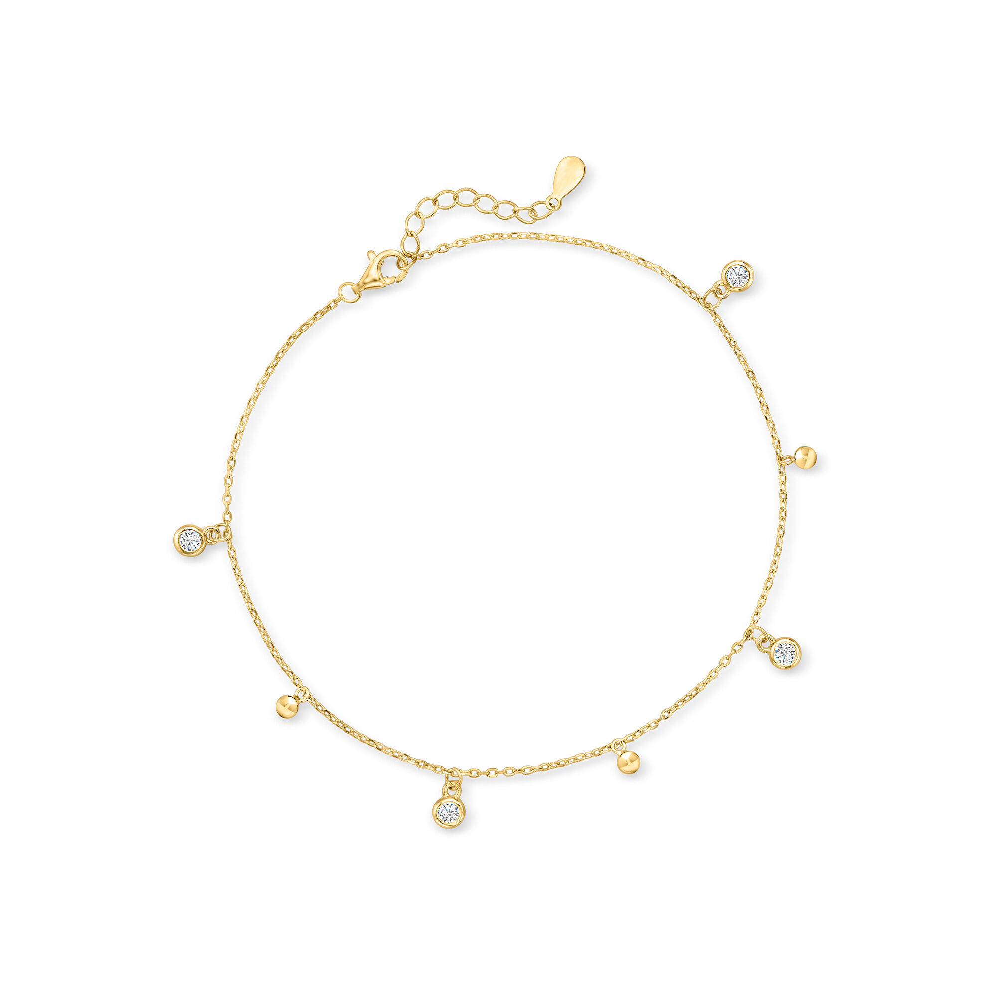 Italian .50 ct. t.w. Bezel-Set CZ and 18kt Gold Over Sterling Bead Station Anklet. 9″