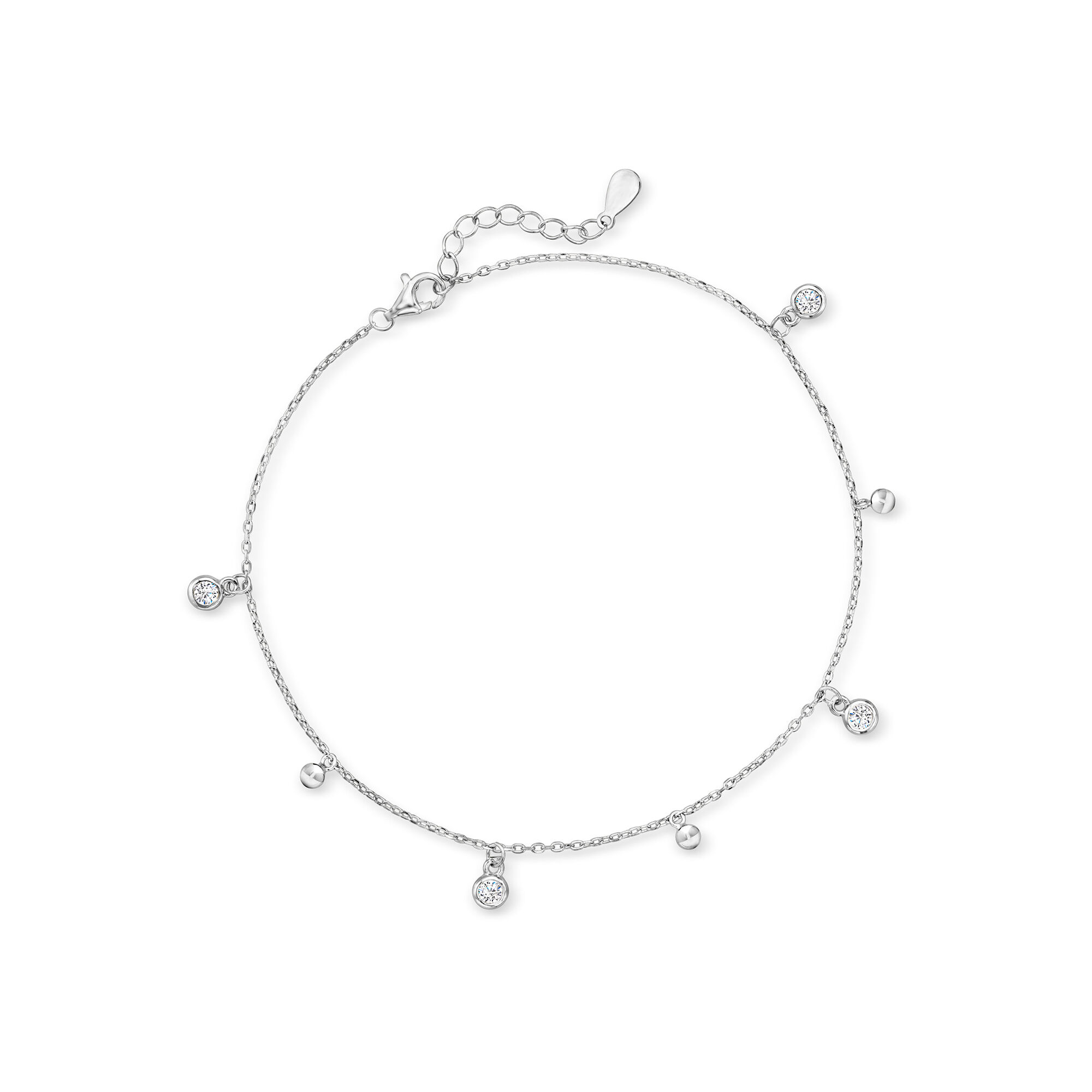Italian .50 ct. t.w. Bezel-Set CZ and Sterling Silver Bead Station Anklet. 9″