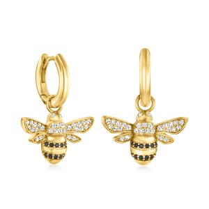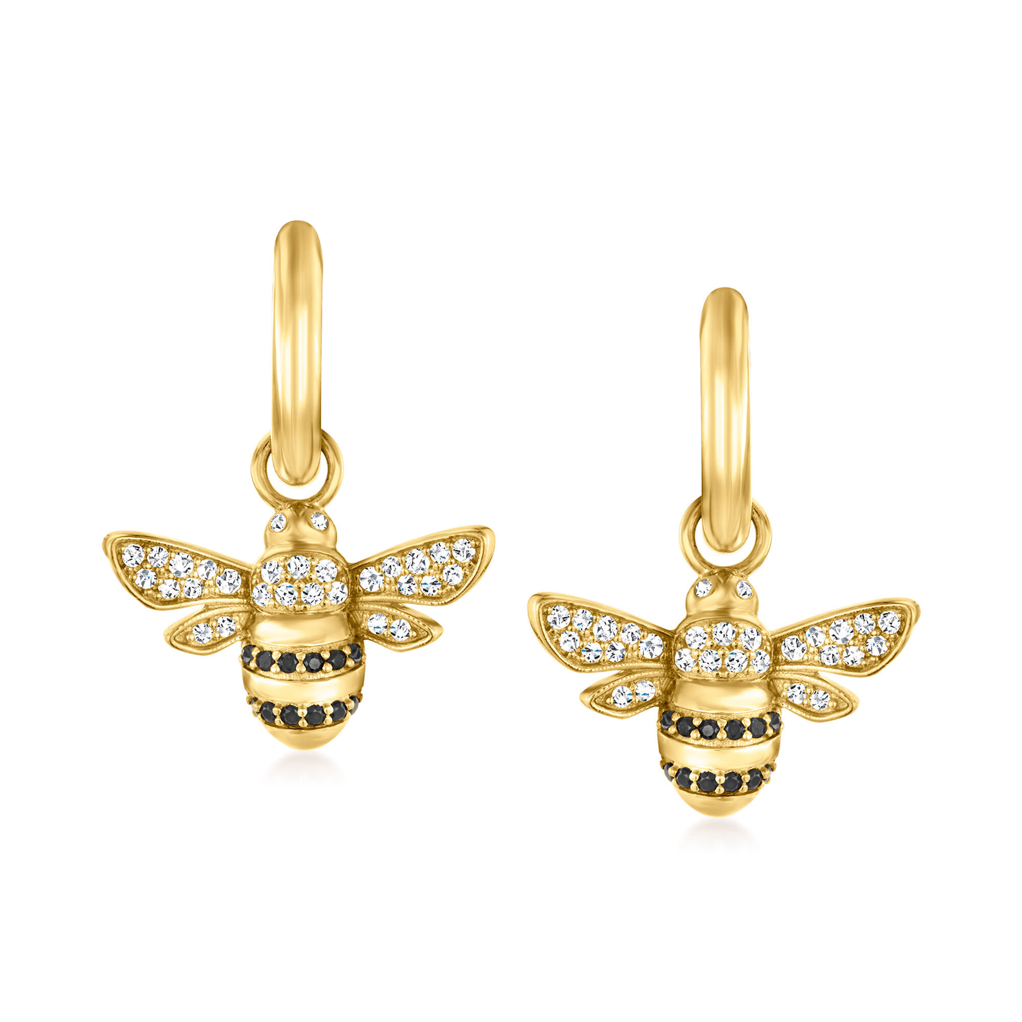 Italian .50 ct. t.w. Black and White CZ Removable Bumblebee Charm Huggie Hoop Earrings in 18kt Gold Over Sterling. 1″