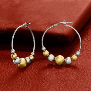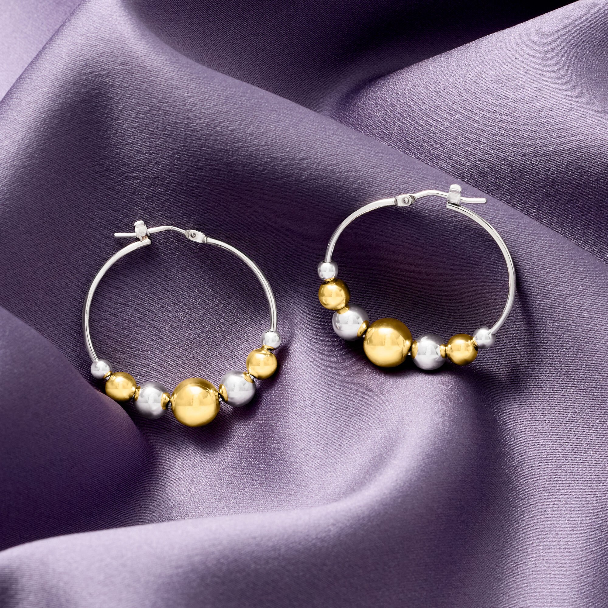 Italian Sterling Silver and 18kt Gold Over Sterling Graduated Bead Hoop Earrings. 1 1/4″