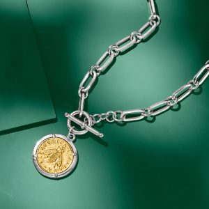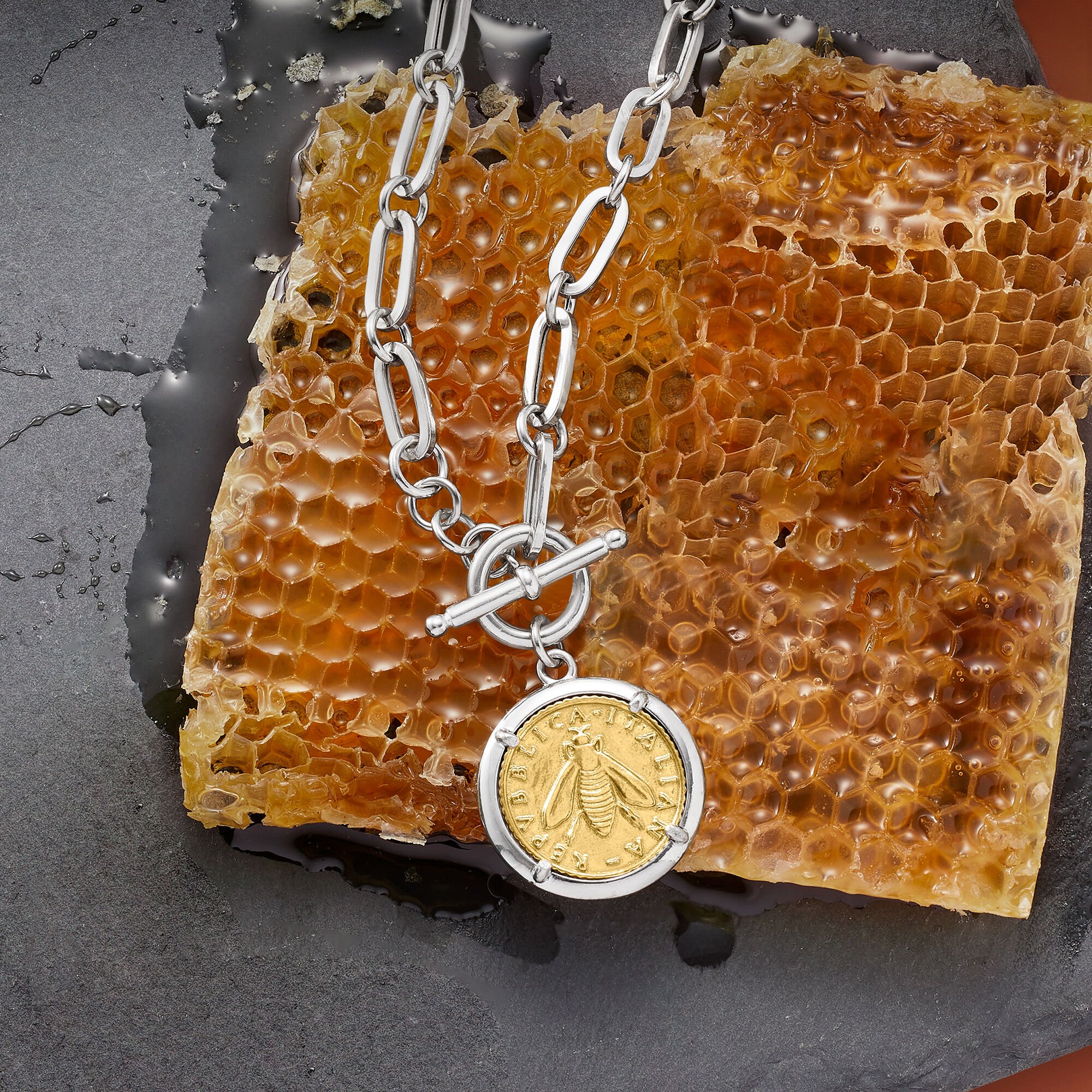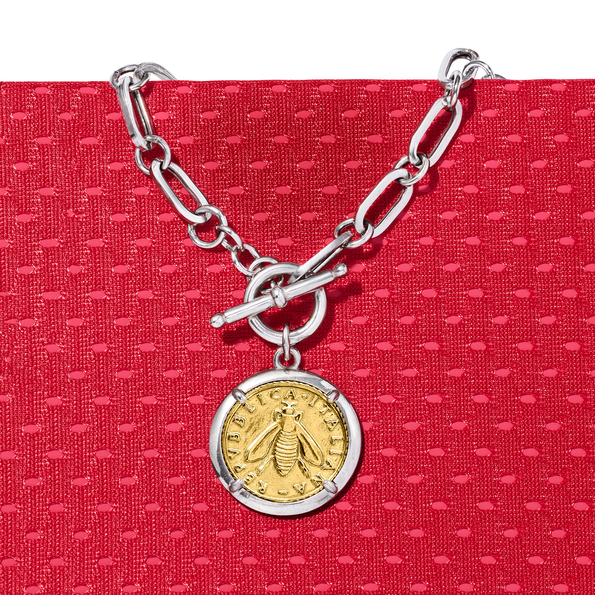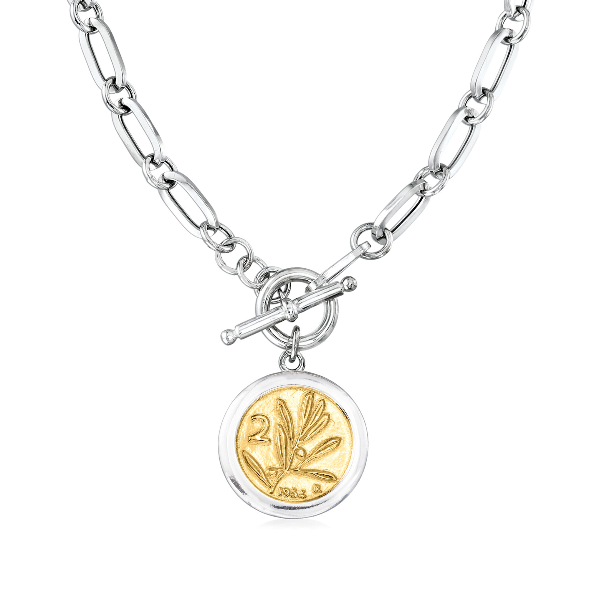 Italian Sterling Silver and 18kt Gold Over Sterling Replica Bumblebee Lira Coin Paper Clip Link Toggle Necklace