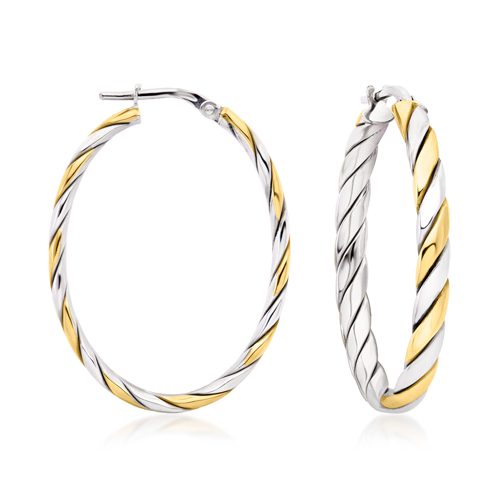 Italian Sterling Silver and 18kt Gold Over Sterling Twisted Oval Hoop Earrings. 1 3/8″