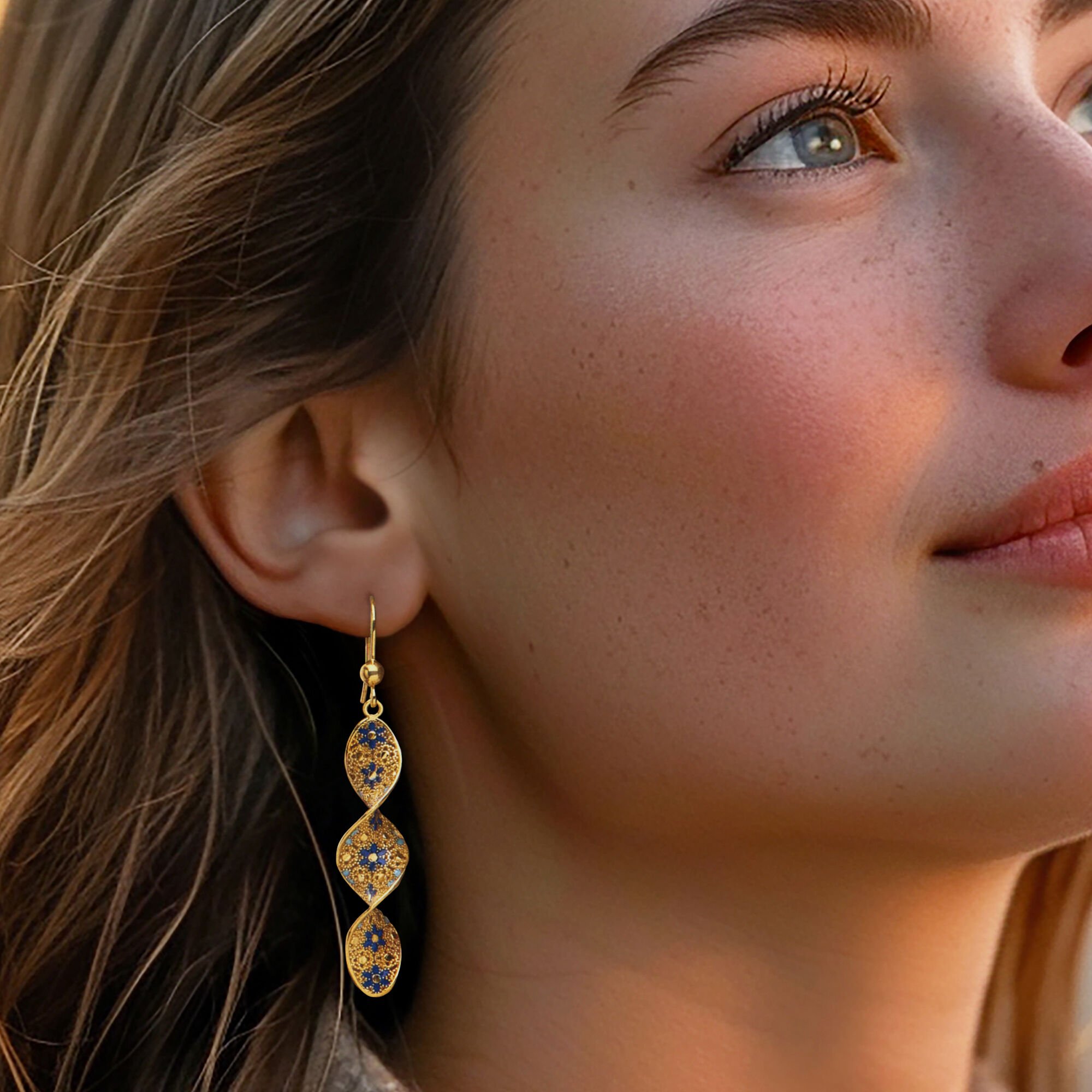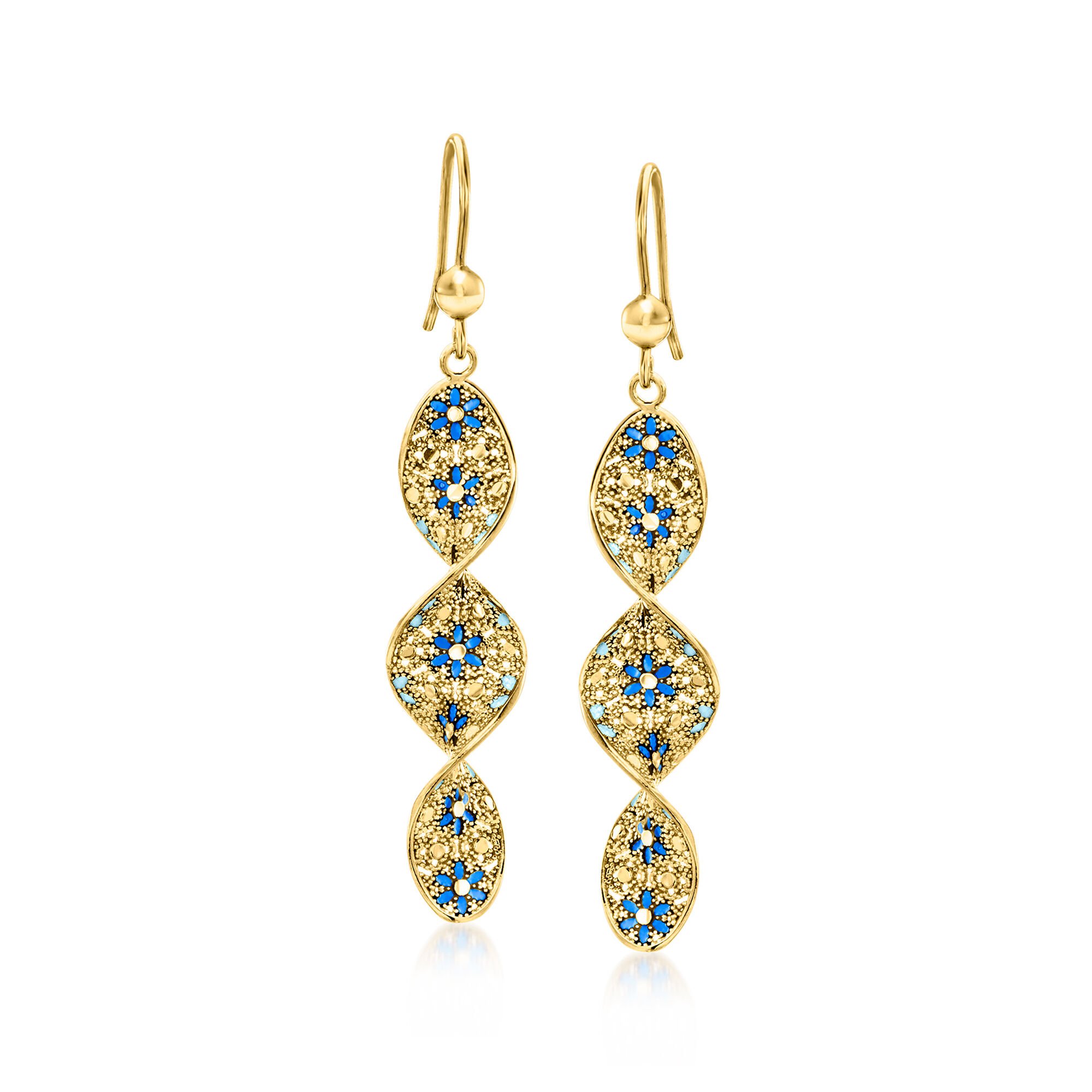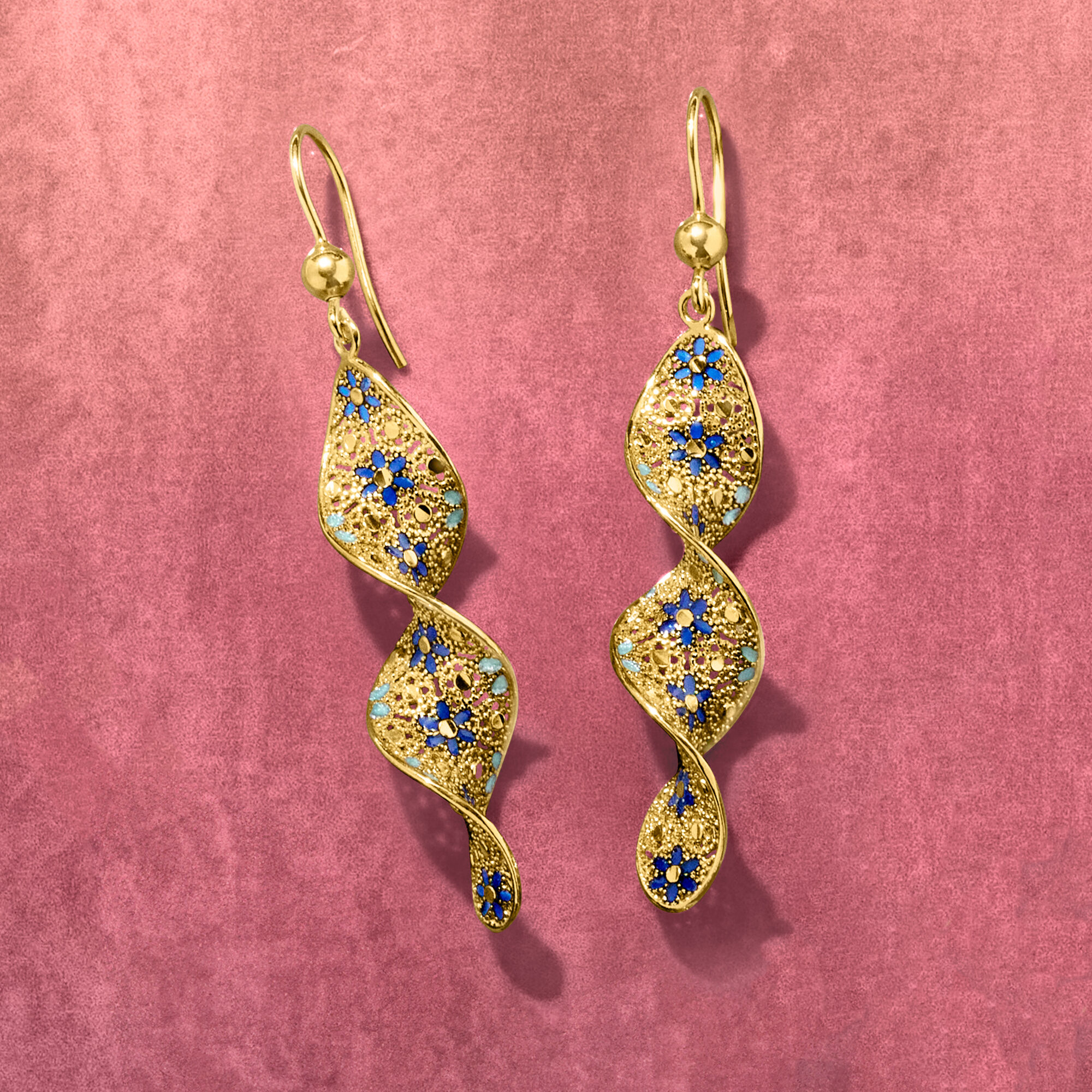 Italian Tonal Blue Enamel Floral Twisted Drop Earrings in 18kt Gold Over Sterling