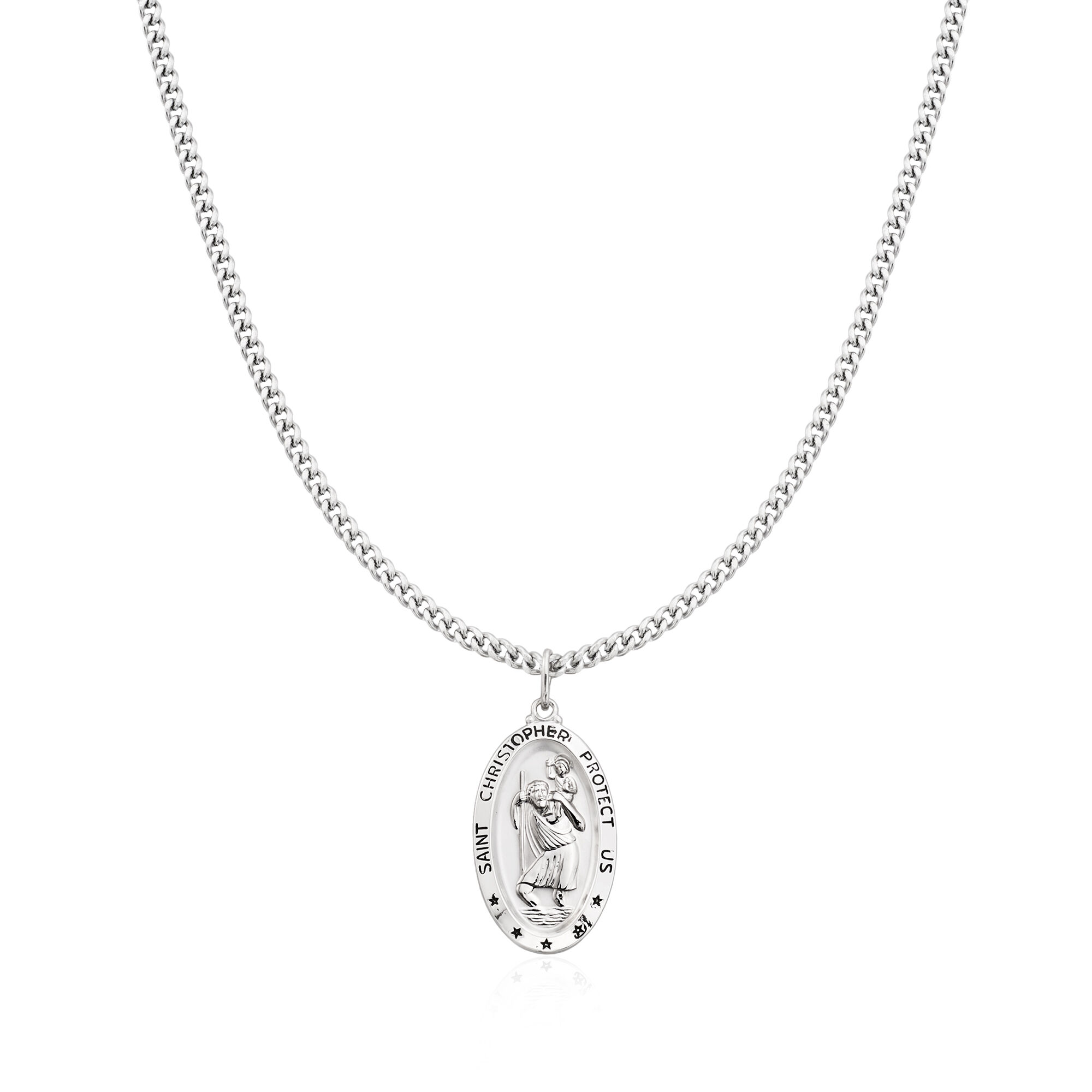 Men’s Sterling Silver Saint Christopher Oval Medal with Stainless Steel Chain. 24″