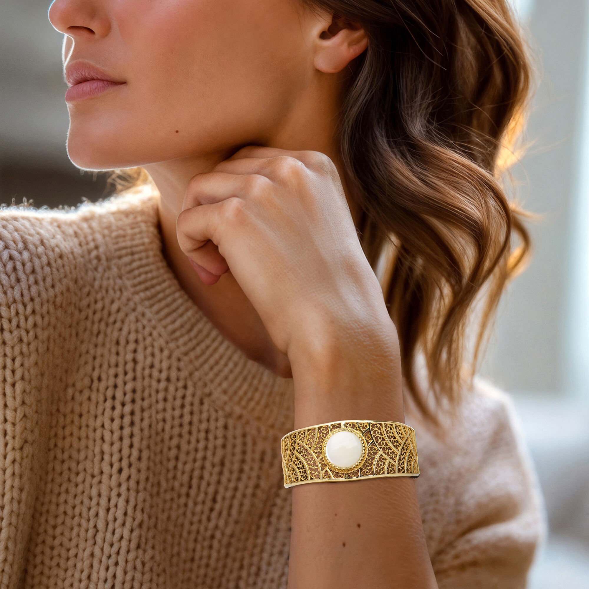 Mother-of-Pearl Filigree Cuff Bracelet in 18kt Gold Over Sterling. 8″