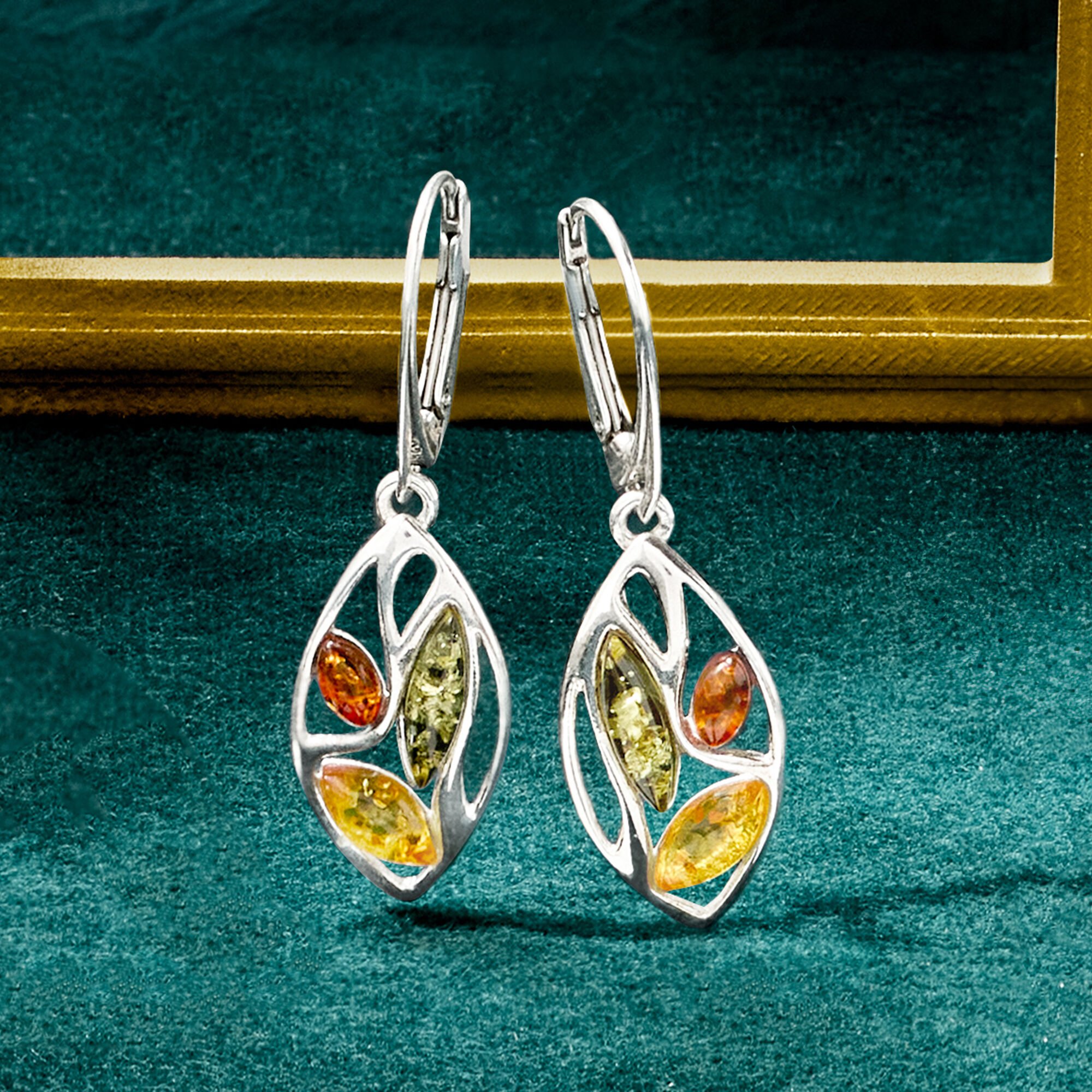 Multicolored Amber Leaf Drop Earrings in Sterling Silver