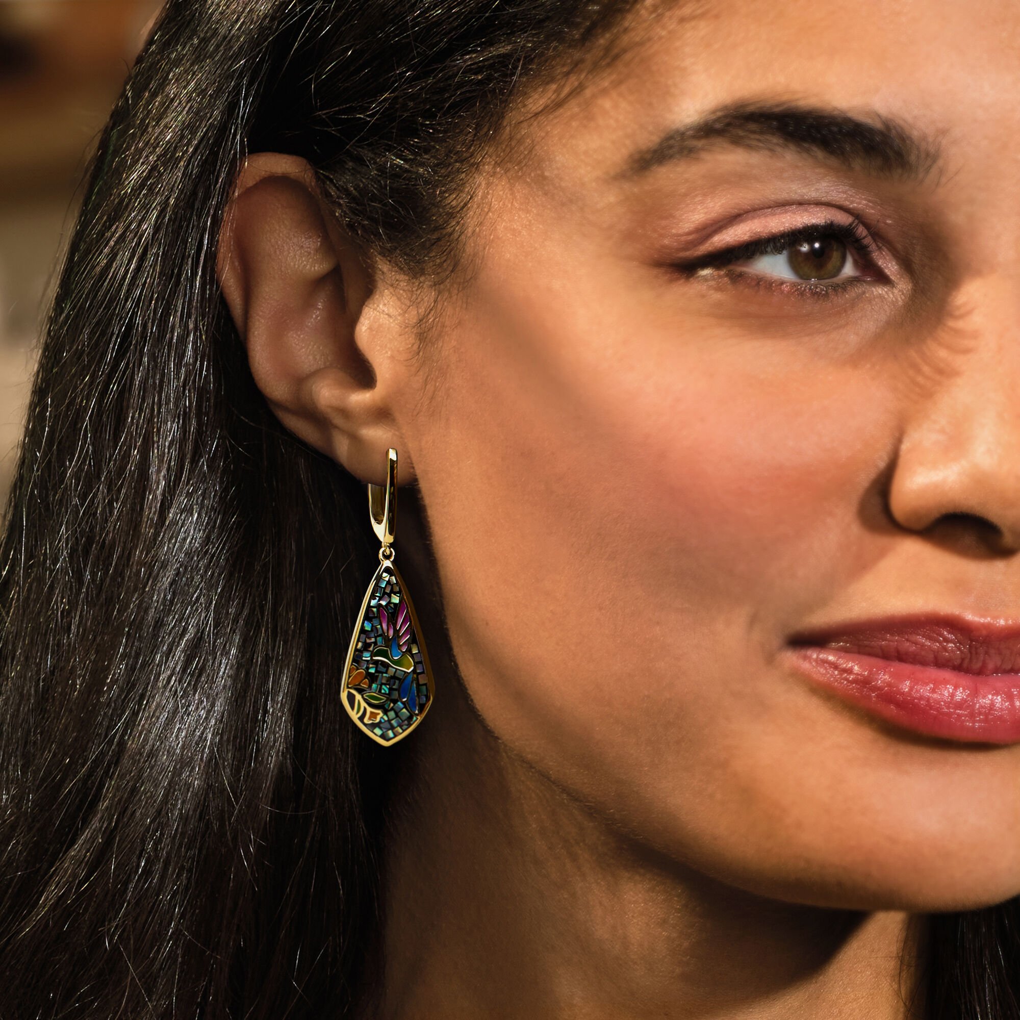 Multicolored Enamel and Abalone Shell Hummingbird Mosaic Drop Earrings in 18kt Gold Over Sterling