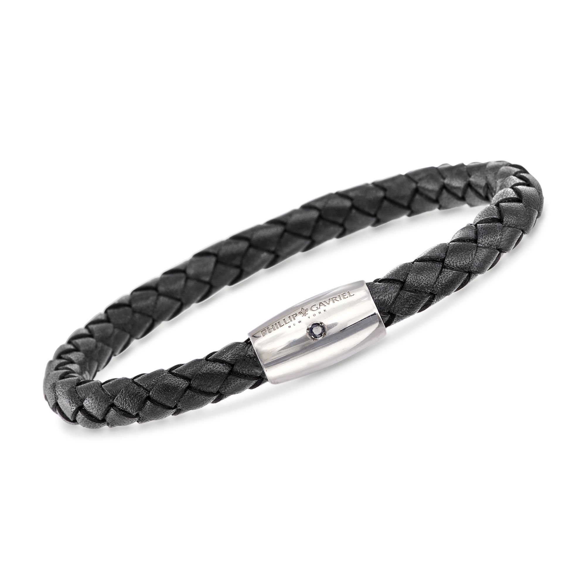 Phillip Gavriel Men’s Black Leather Bracelet with Single Sapphire in Sterling Silver. 8″