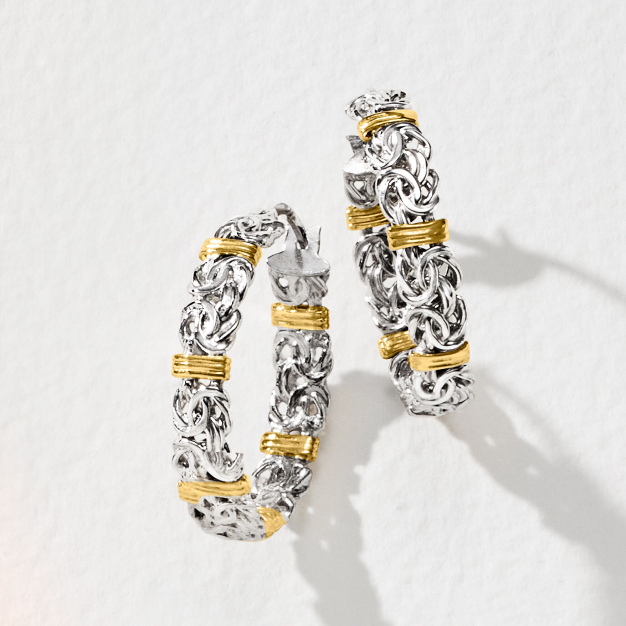 Sterling Silver and 14kt Yellow Gold Byzantine Station Hoop Earrings. 1″