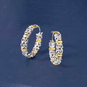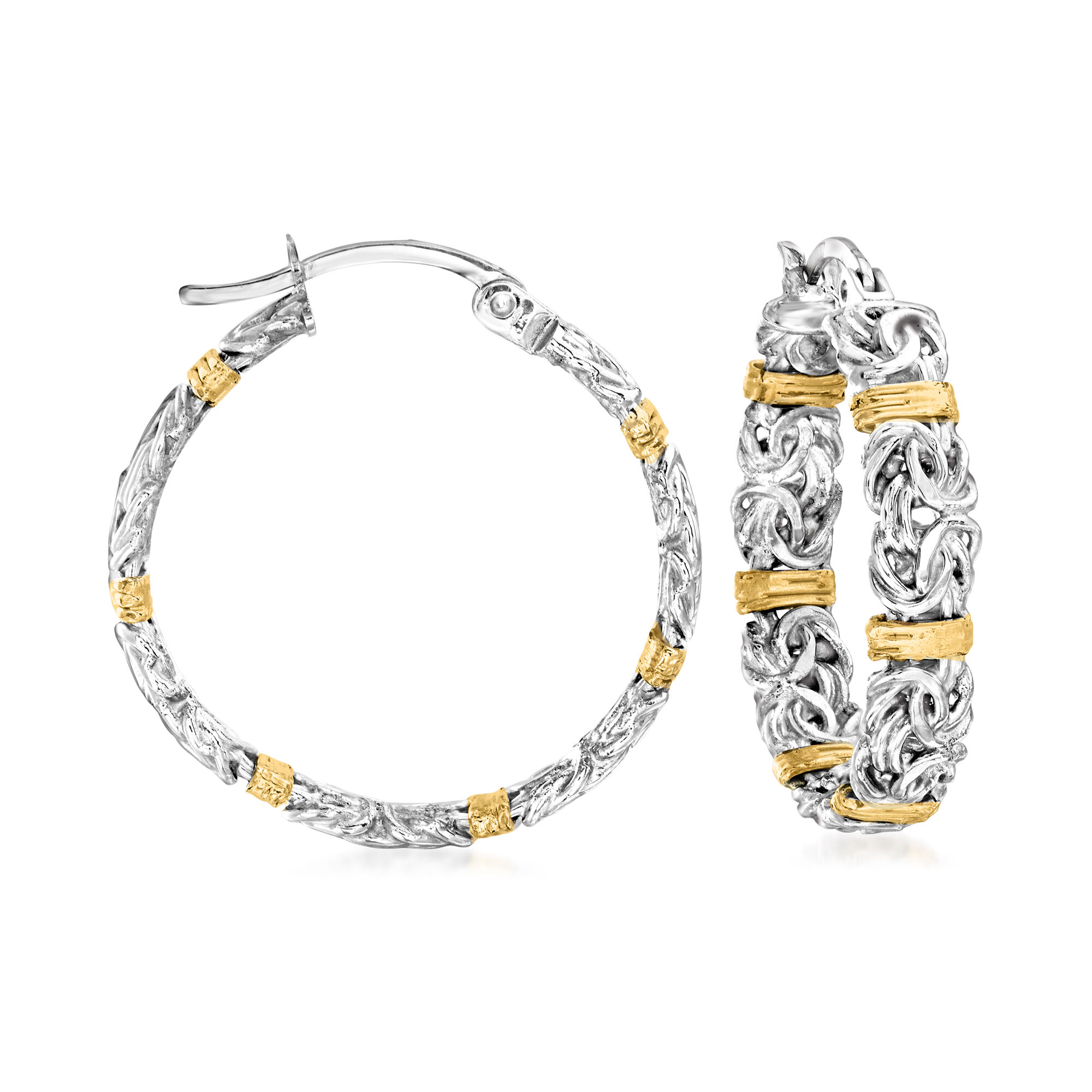 Sterling Silver and 14kt Yellow Gold Byzantine Station Hoop Earrings. 1″