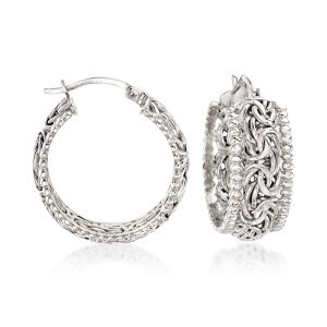 Sterling Silver Beaded-Edge Byzantine Hoop Earrings. 1″
