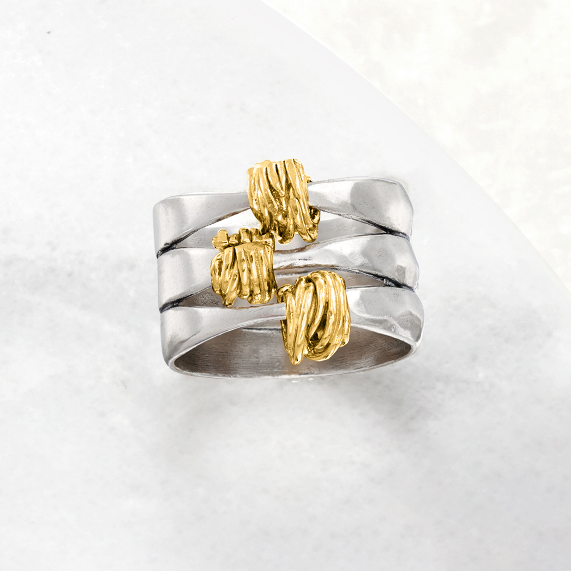 Sterling Silver and 18kt Yellow Gold Bali-Style Overlapping Buckle Ring
